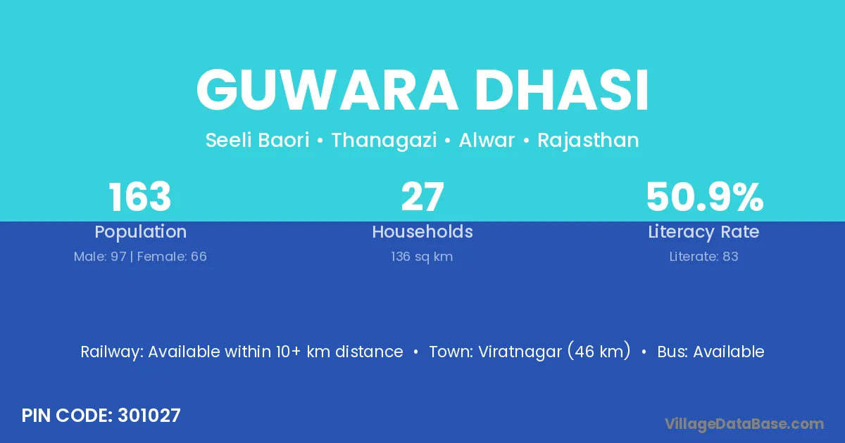 Viratnagar (46 km) is the nearest town to Guwara Dhasi village for major economic activities and is located approximately 46 km away.