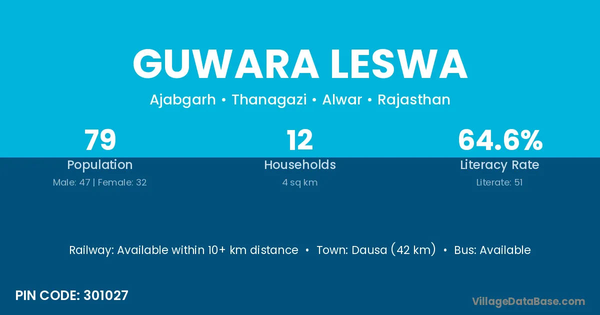 Dausa (42 km) is the nearest town to Guwara Leswa village for major economic activities and is located approximately 42 km away.