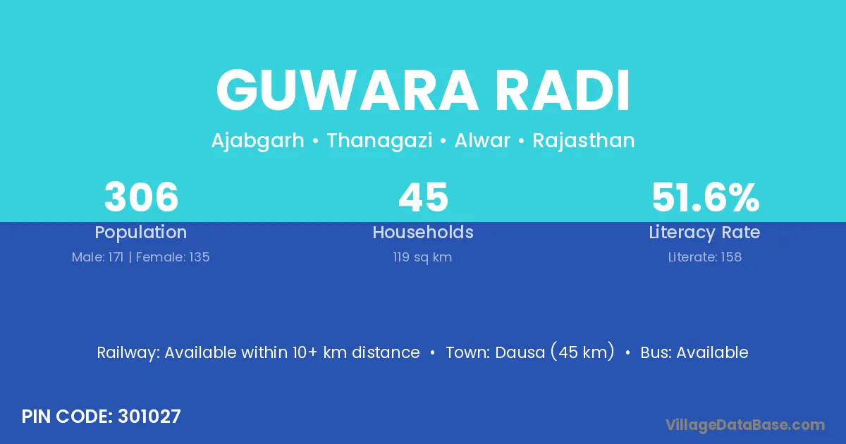 Dausa (45 km) is the nearest town to Guwara Radi village for major economic activities and is located approximately 45 km away.