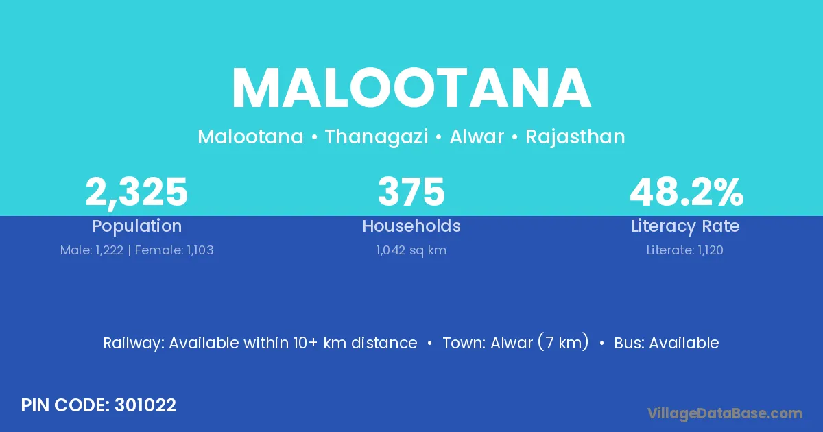 Alwar (7 km) is the nearest town to Malootana village for major economic activities and is located approximately 7 km away.