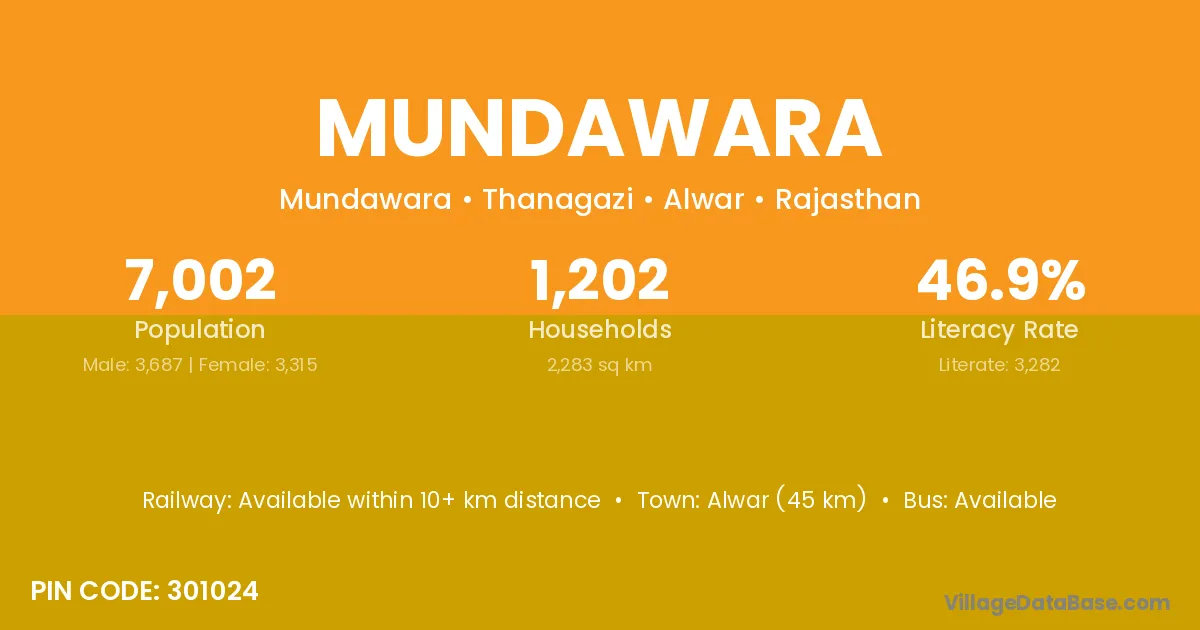 Alwar (45 km) is the nearest town to Mundawara village for major economic activities and is located approximately 45 km away.