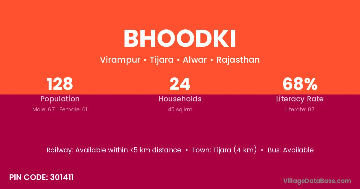 Tijara (4 km) is the nearest town to Bhoodki village for major economic activities and is located approximately 4 km away.