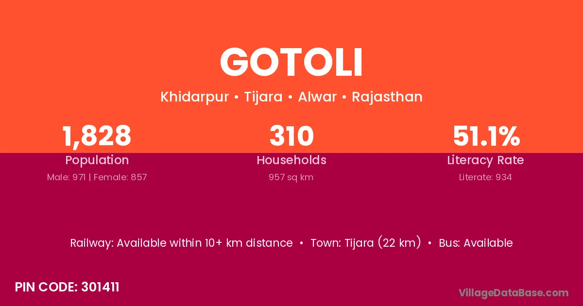 Gotoli village has a total population of 1,828 people, of which 971 are males and 857 are females.