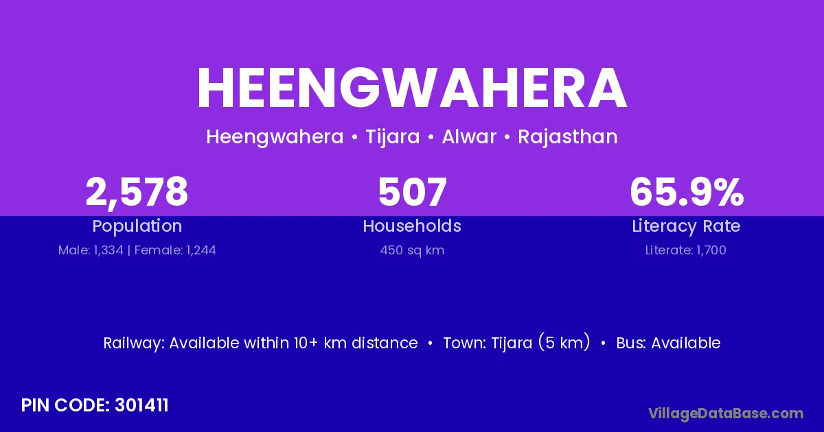 Tijara (5 km) is the nearest town to Heengwahera village for major economic activities and is located approximately 5 km away.