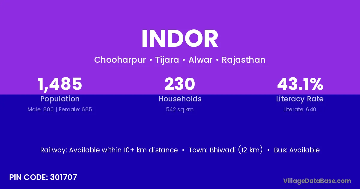 Bhiwadi (12 km) is the nearest town to Indor village for major economic activities and is located approximately 12 km away.