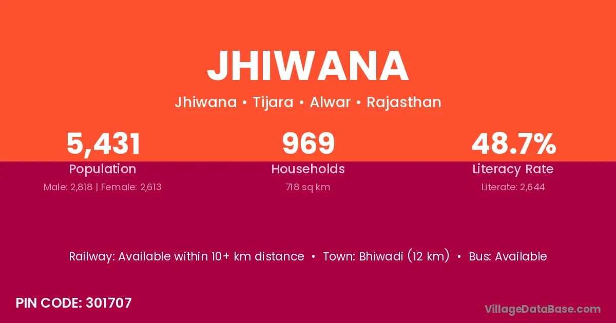 Bhiwadi (12 km) is the nearest town to Jhiwana village for major economic activities and is located approximately 12 km away.
