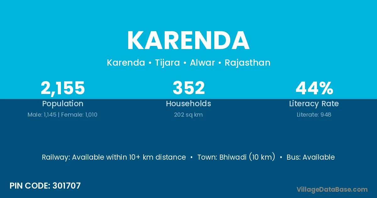 Bhiwadi (10 km) is the nearest town to Karenda village for major economic activities and is located approximately 10 km away.
