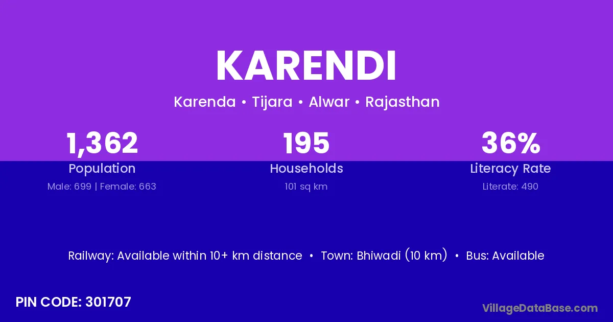 Bhiwadi (10 km) is the nearest town to Karendi village for major economic activities and is located approximately 10 km away.