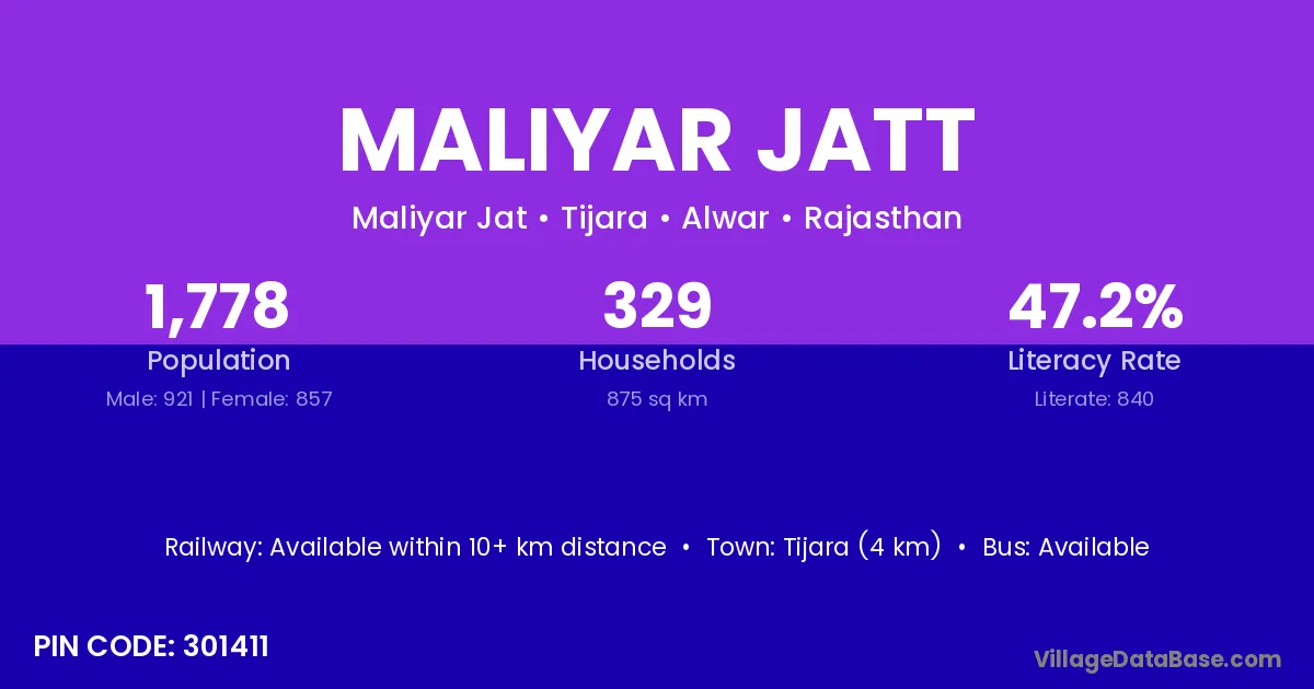 Tijara (4 km) is the nearest town to Maliyar Jatt village for major economic activities and is located approximately 4 km away.