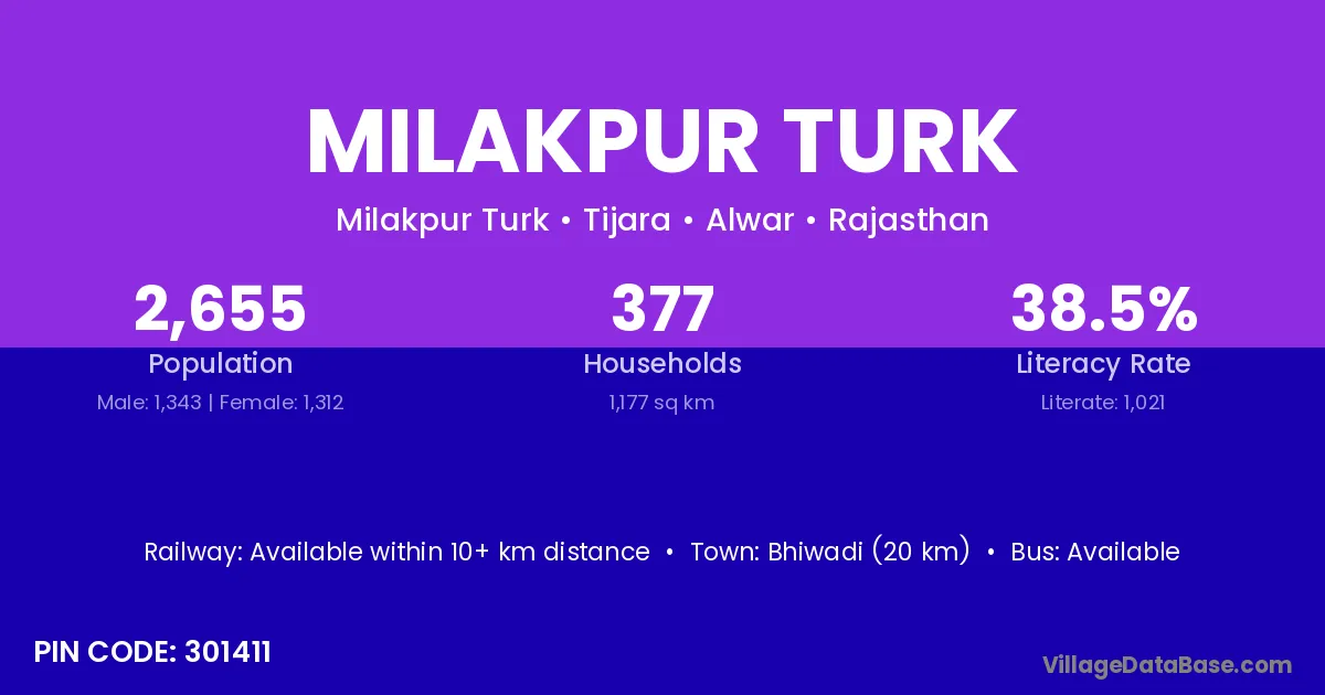 Bhiwadi (20 km) is the nearest town to Milakpur Turk village for major economic activities and is located approximately 20 km away.