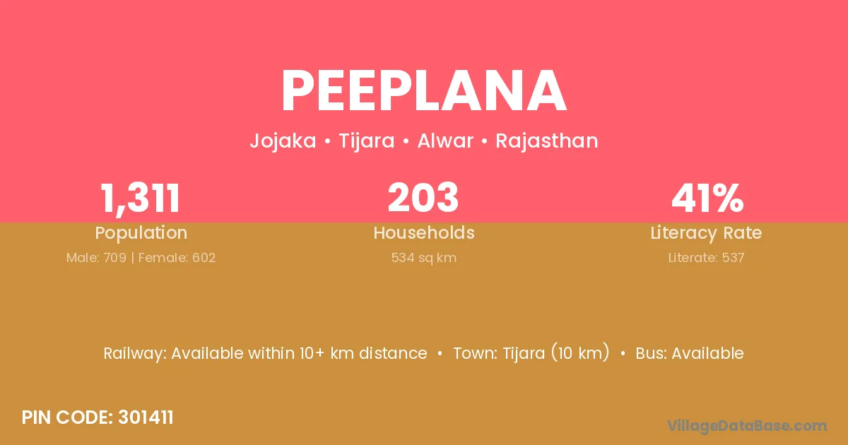 Tijara (10 km) is the nearest town to Peeplana village for major economic activities and is located approximately 10 km away.