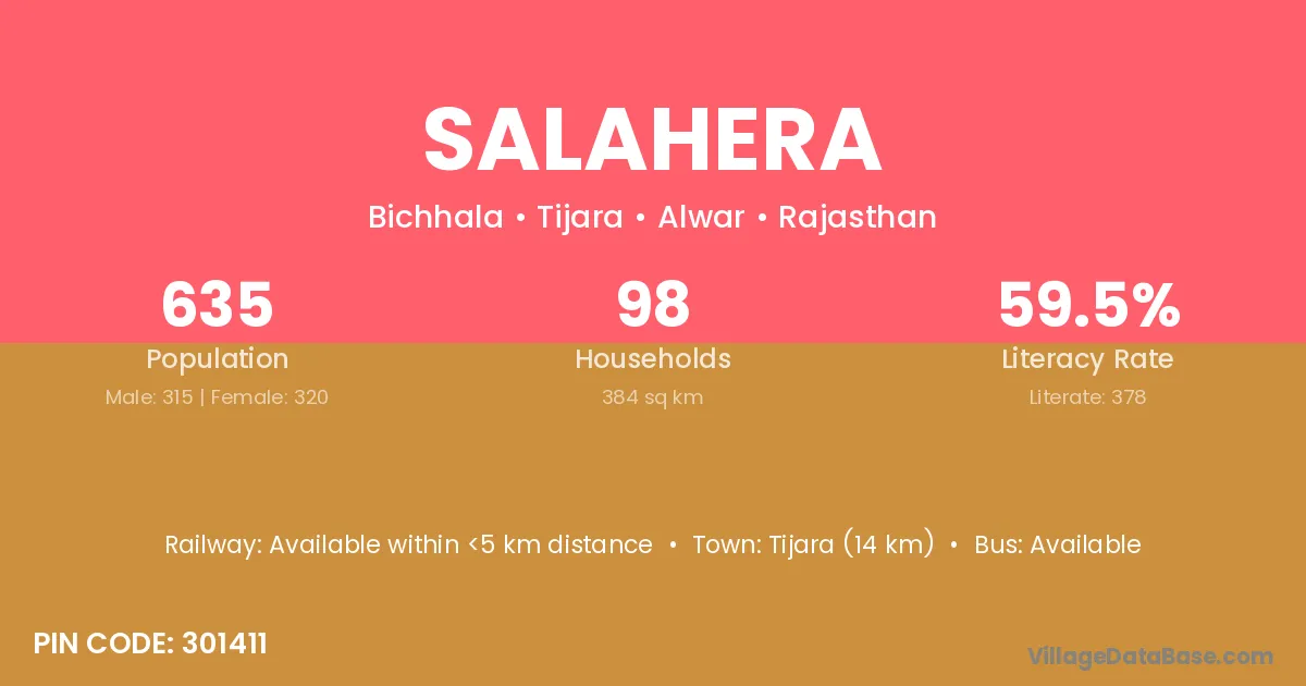 Tijara (14 km) is the nearest town to Salahera village for major economic activities and is located approximately 14 km away.