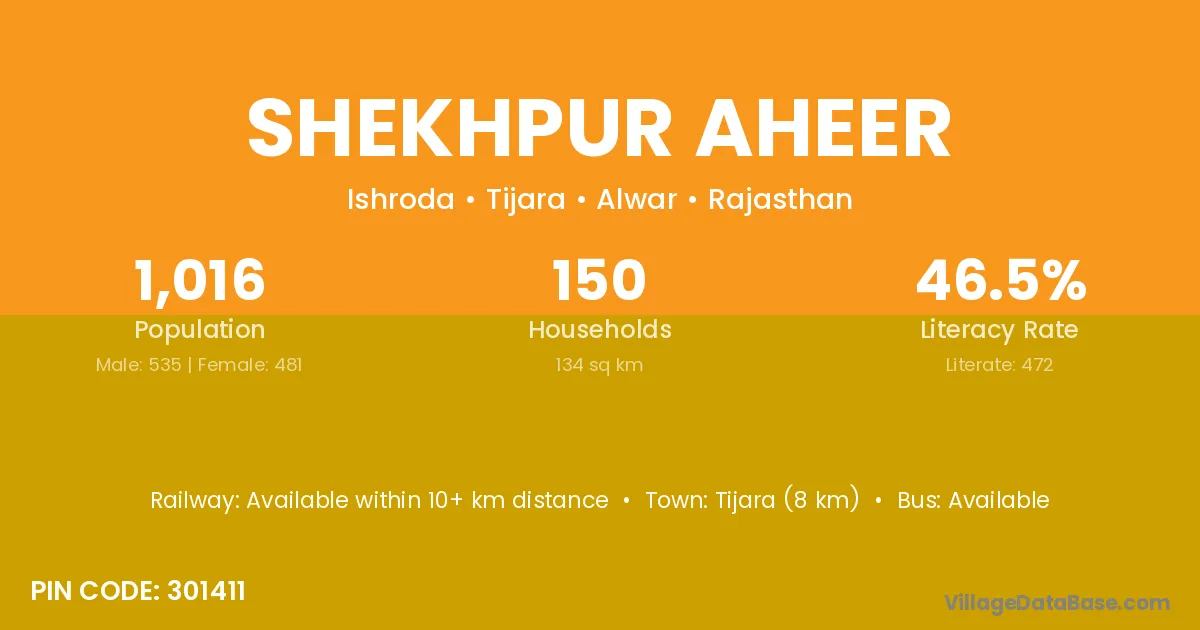 Tijara (8 km) is the nearest town to Shekhpur Aheer village for major economic activities and is located approximately 8 km away.