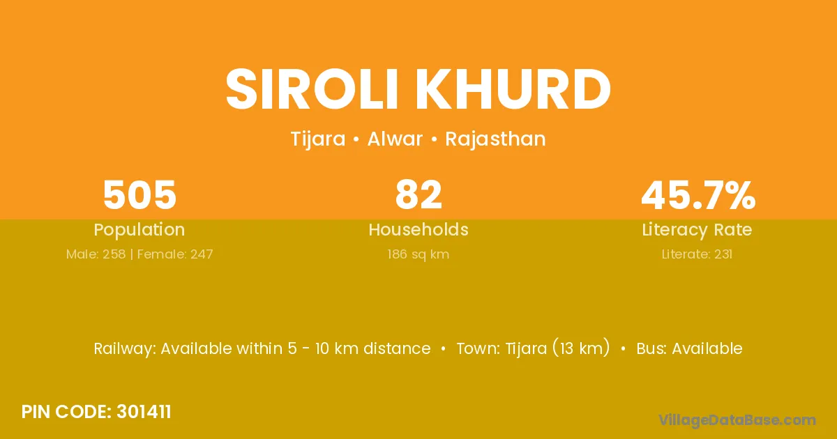 Tijara (13 km) is the nearest town to Siroli Khurd village for major economic activities and is located approximately 13 km away.