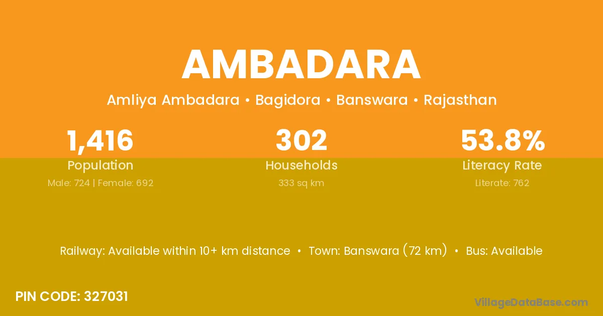 Banswara (72 km) is the nearest town to Ambadara village for major economic activities and is located approximately 72 km away.