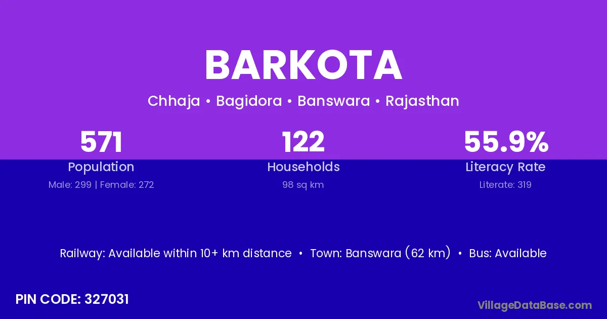 Banswara (62 km) is the nearest town to Barkota village for major economic activities and is located approximately 62 km away.