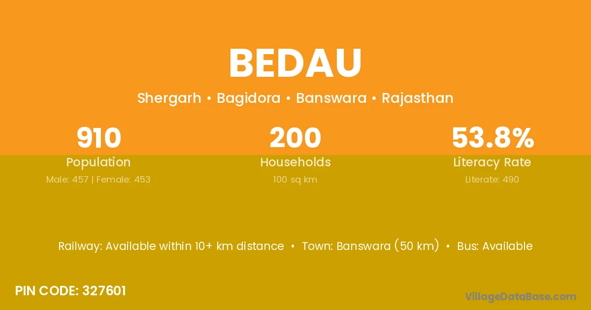 Banswara (50 km) is the nearest town to Bedau village for major economic activities and is located approximately 50 km away.