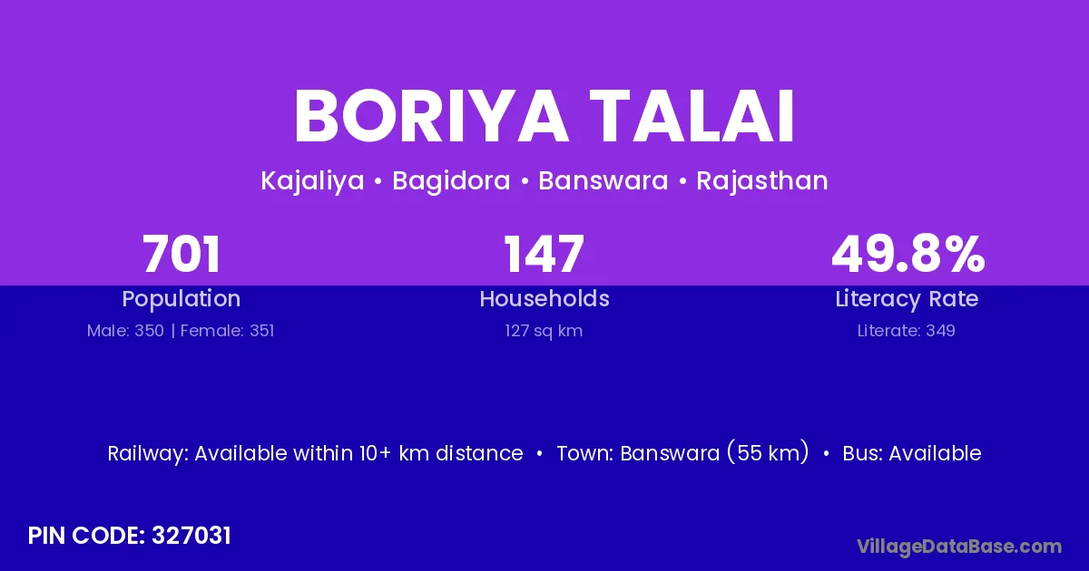 Banswara (55 km) is the nearest town to Boriya Talai village for major economic activities and is located approximately 55 km away.