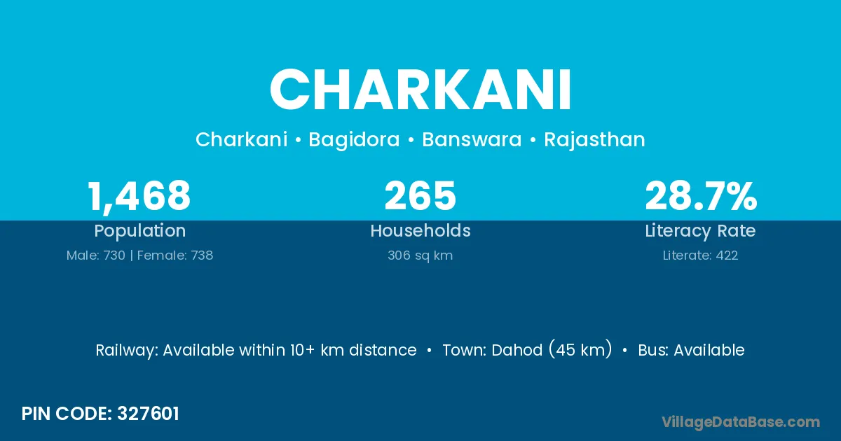 Dahod (45 km) is the nearest town to Charkani village for major economic activities and is located approximately 45 km away.