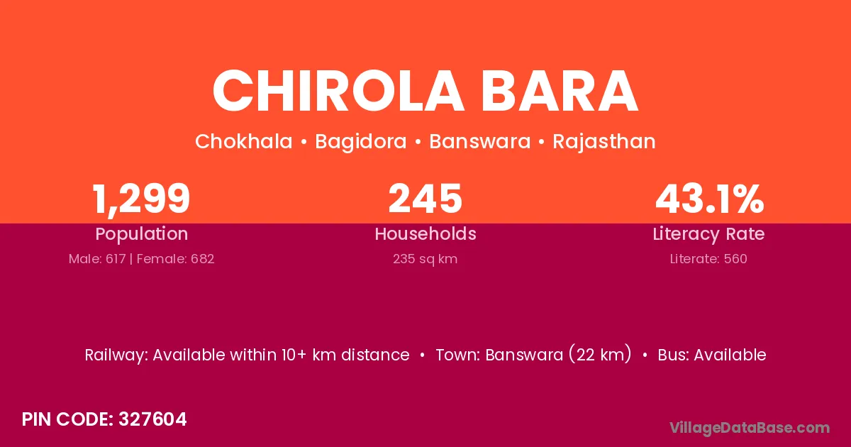 Banswara (22 km) is the nearest town to Chirola Bara village for major economic activities and is located approximately 22 km away.