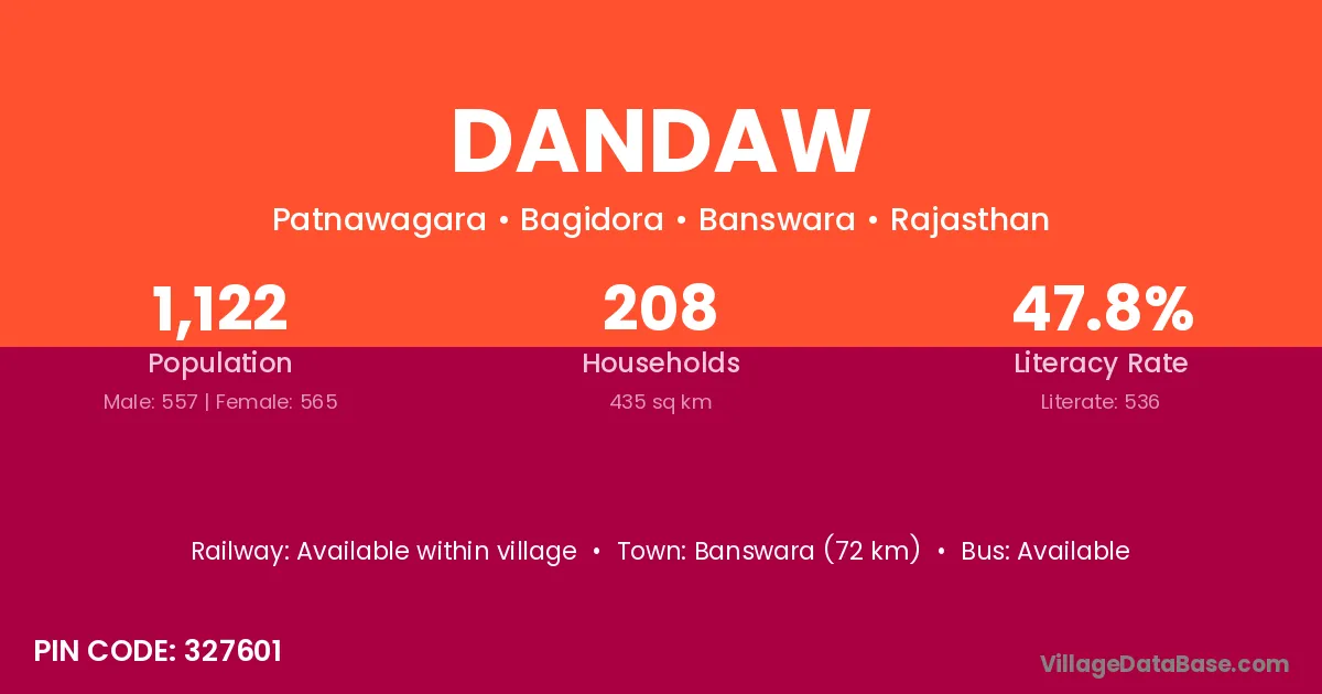 Banswara (72 km) is the nearest town to Dandaw village for major economic activities and is located approximately 72 km away.