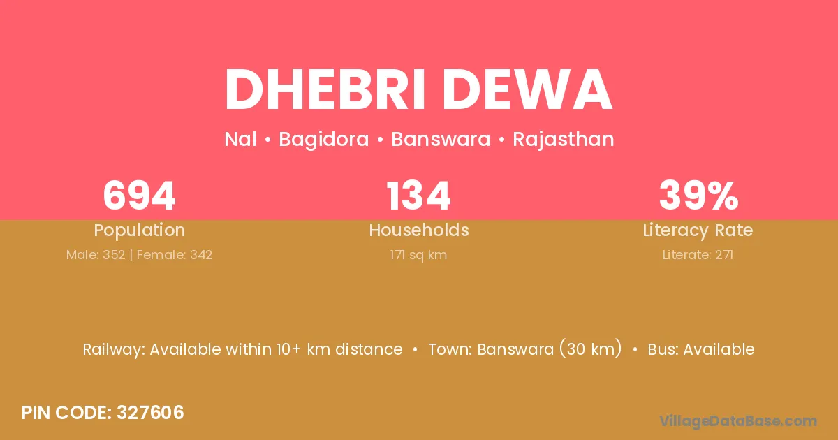 Banswara (30 km) is the nearest town to Dhebri Dewa village for major economic activities and is located approximately 30 km away.