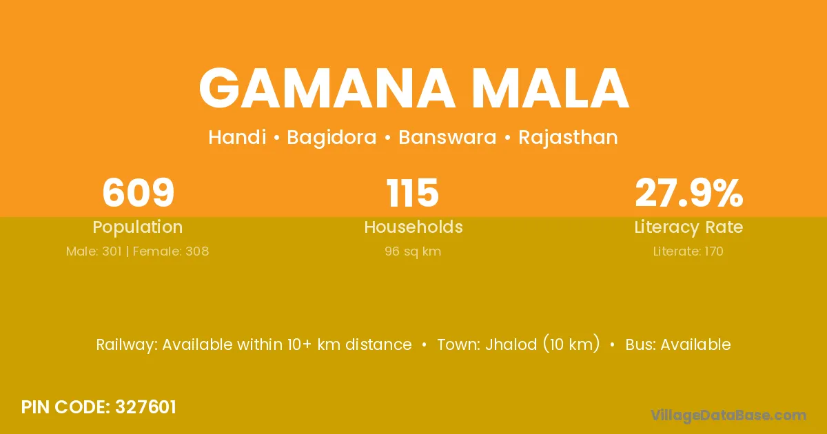 Jhalod (10 km) is the nearest town to Gamana Mala village for major economic activities and is located approximately 10 km away.
