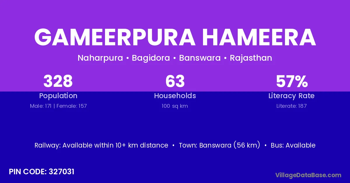 Banswara (56 km) is the nearest town to Gameerpura Hameera village for major economic activities and is located approximately 56 km away.