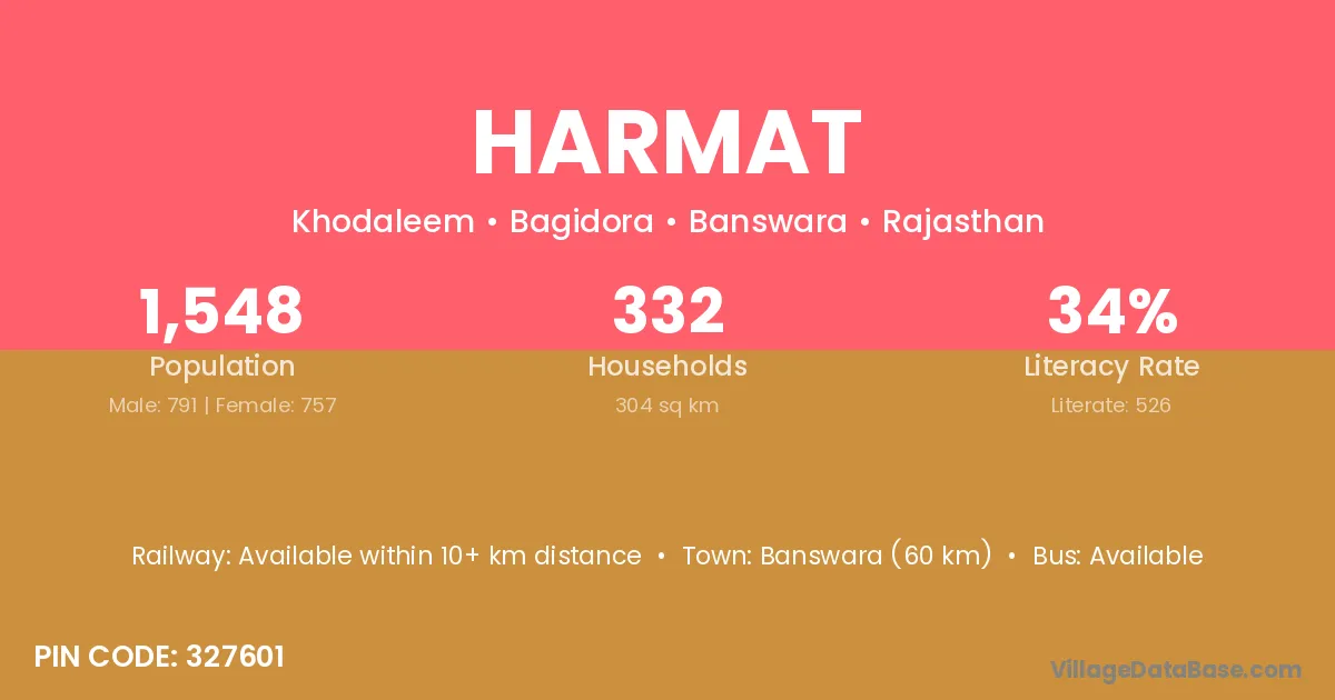 Banswara (60 km) is the nearest town to Harmat village for major economic activities and is located approximately 60 km away.