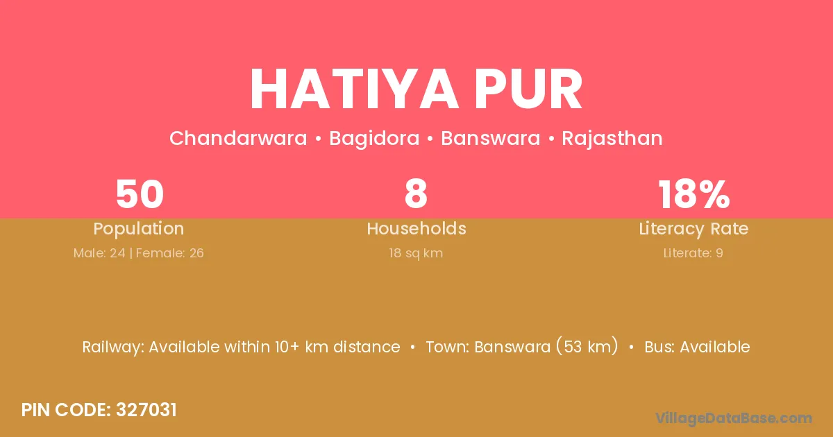 Banswara (53 km) is the nearest town to Hatiya Pur village for major economic activities and is located approximately 53 km away.