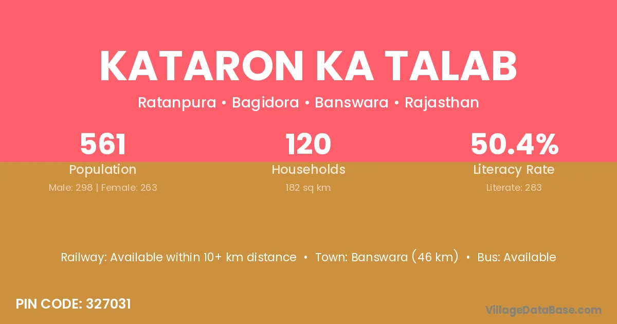 Banswara (46 km) is the nearest town to Kataron Ka Talab village for major economic activities and is located approximately 46 km away.