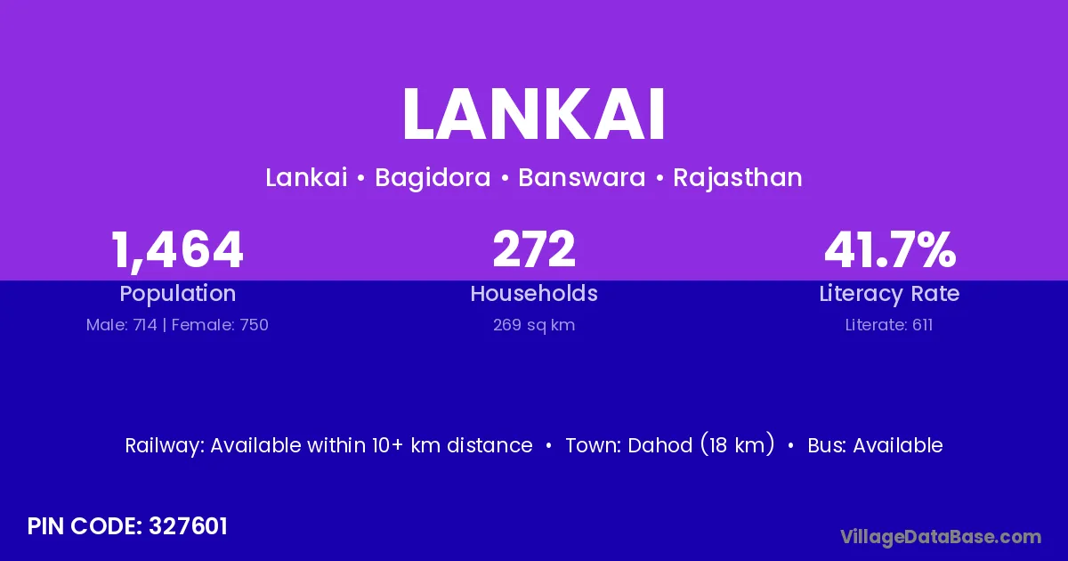 Dahod (18 km) is the nearest town to Lankai village for major economic activities and is located approximately 18 km away.