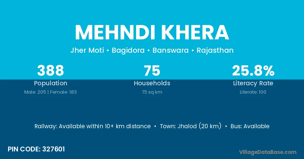 Jhalod (20 km) is the nearest town to Mehndi Khera village for major economic activities and is located approximately 20 km away.