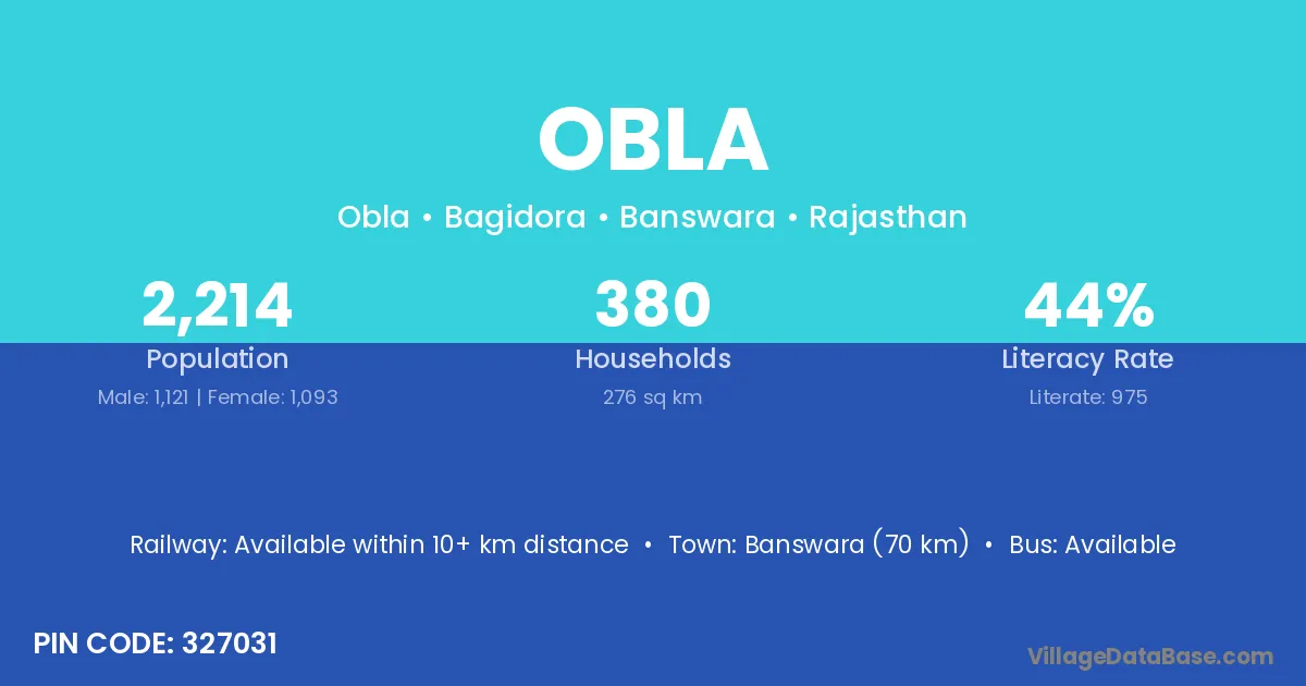 Banswara (70 km) is the nearest town to Obla village for major economic activities and is located approximately 70 km away.
