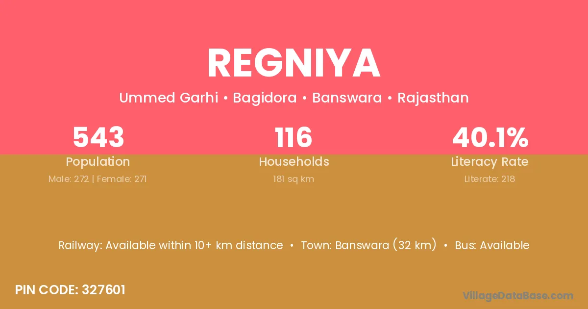 Banswara (32 km) is the nearest town to Regniya village for major economic activities and is located approximately 32 km away.