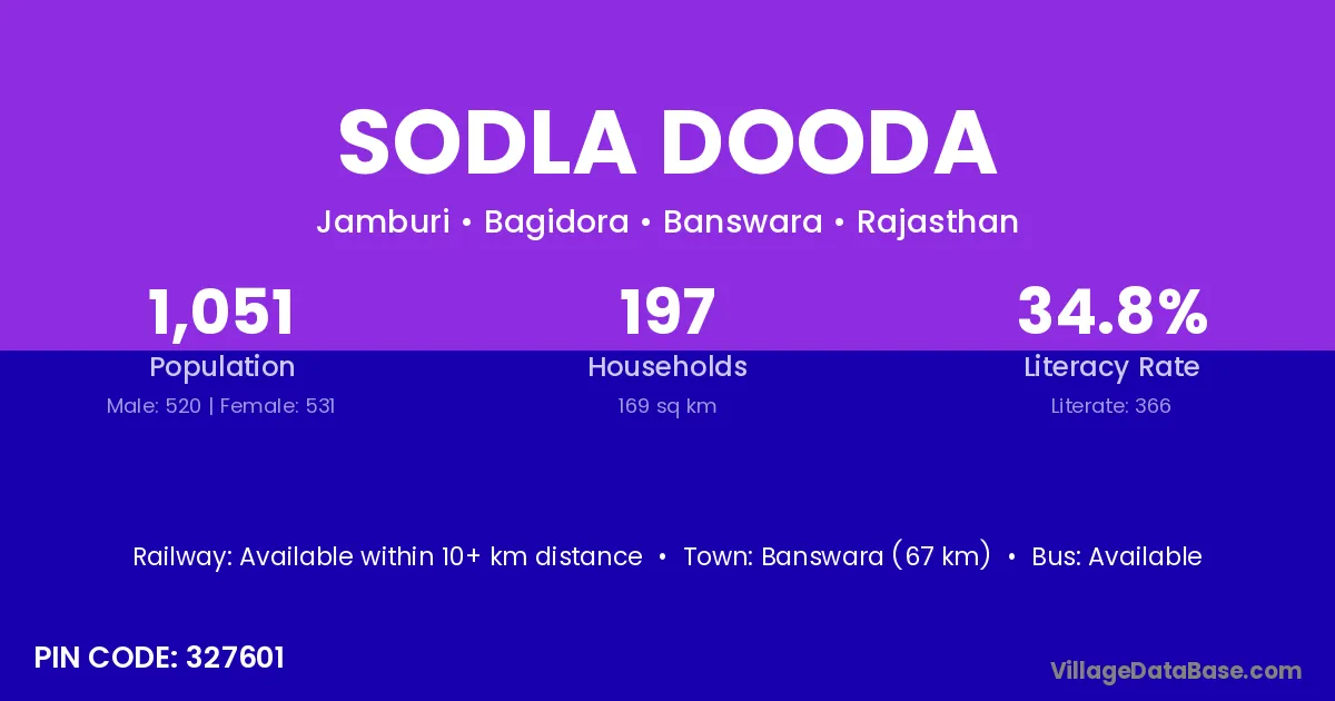 Banswara (67 km) is the nearest town to Sodla Dooda village for major economic activities and is located approximately 67 km away.
