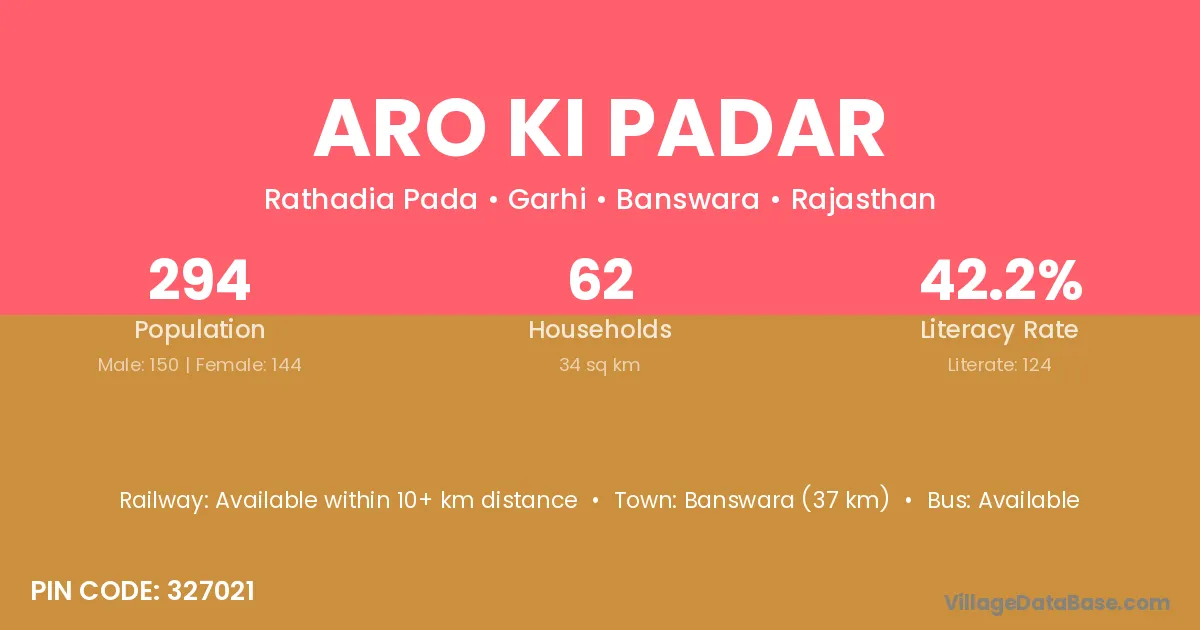 Banswara (37 km) is the nearest town to Aro Ki Padar village for major economic activities and is located approximately 37 km away.
