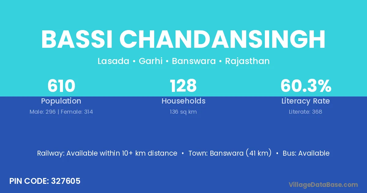Banswara (41 km) is the nearest town to Bassi Chandansingh village for major economic activities and is located approximately 41 km away.