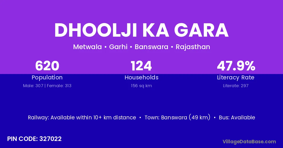 Dhoolji Ka Gara village has a total population of 620 people, of which 307 are males and 313 are females.