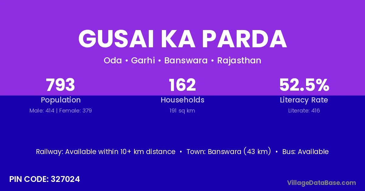Banswara (43 km) is the nearest town to Gusai Ka Parda village for major economic activities and is located approximately 43 km away.
