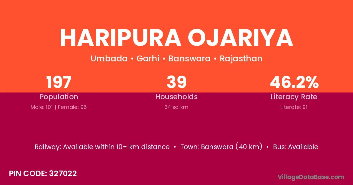 Banswara (40 km) is the nearest town to Haripura Ojariya village for major economic activities and is located approximately 40 km away.