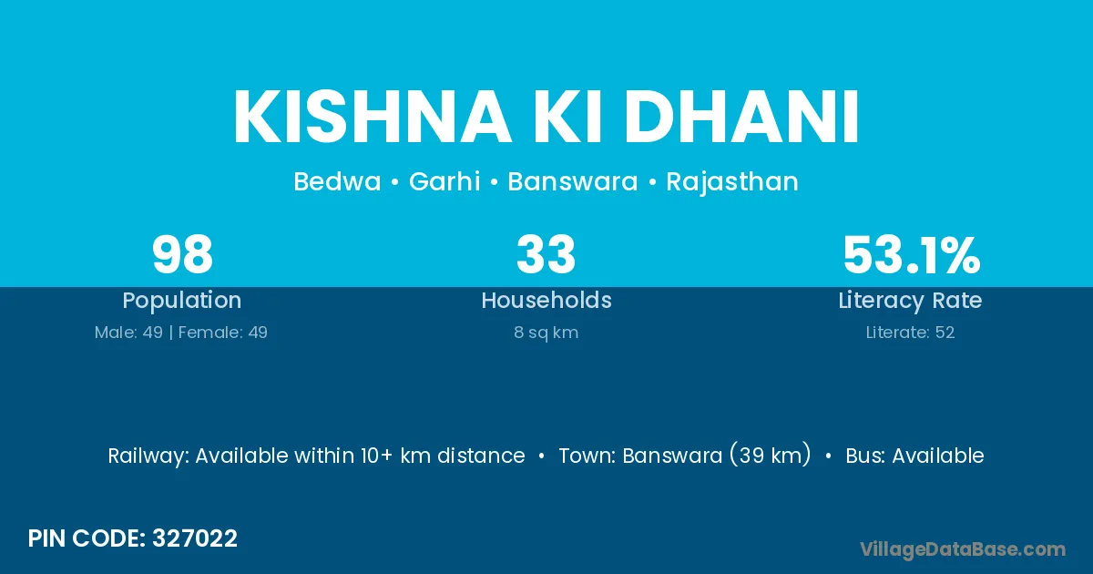 Banswara (39 km) is the nearest town to Kishna Ki Dhani village for major economic activities and is located approximately 39 km away.