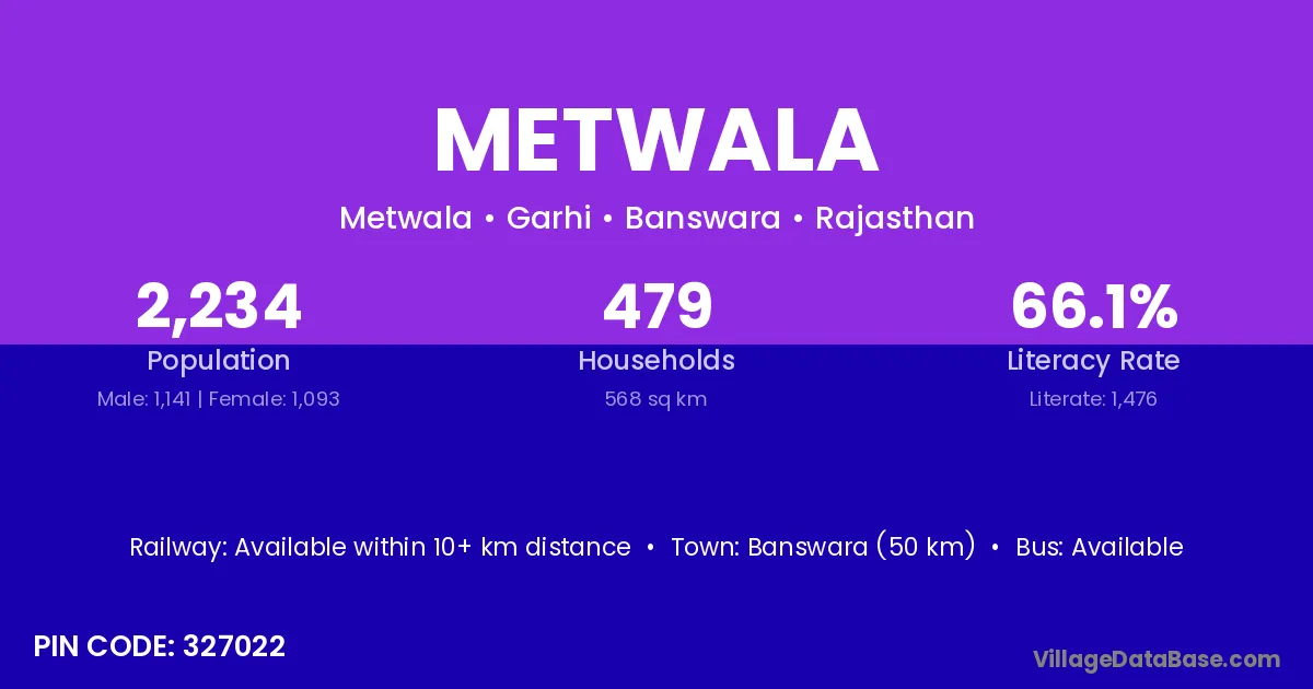 Banswara (50 km) is the nearest town to Metwala village for major economic activities and is located approximately 50 km away.