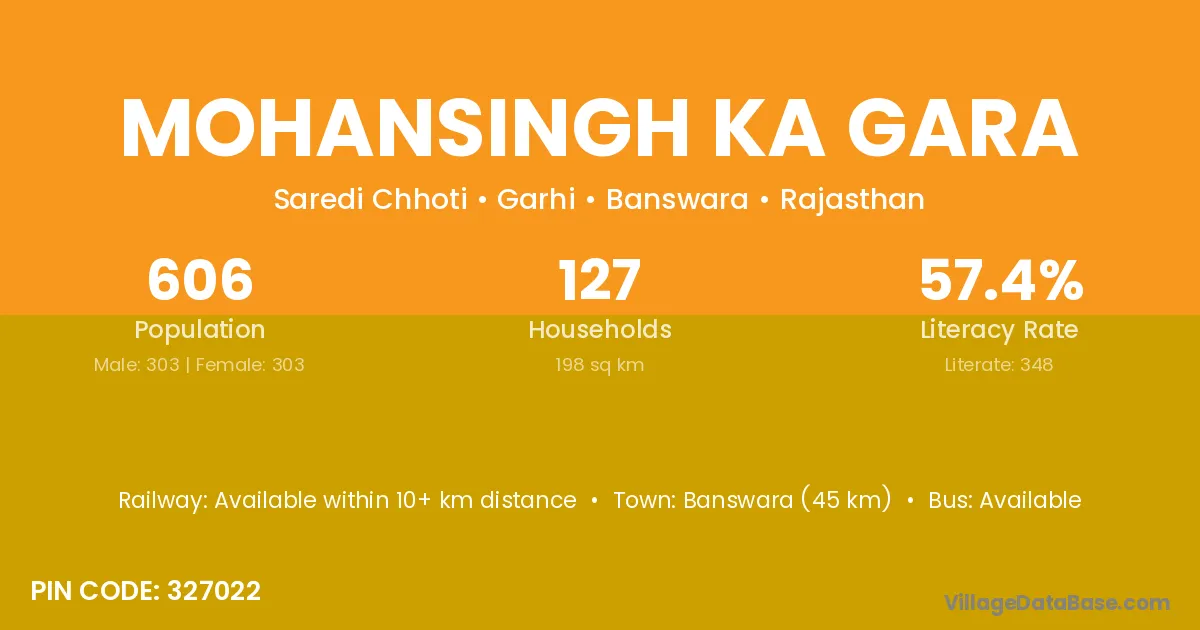 Mohansingh Ka Gara village has a total population of 606 people, of which 303 are males and 303 are females.