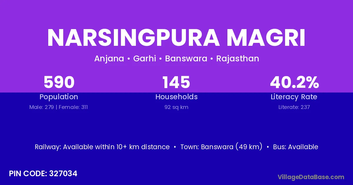 Banswara (49 km) is the nearest town to Narsingpura Magri village for major economic activities and is located approximately 49 km away.