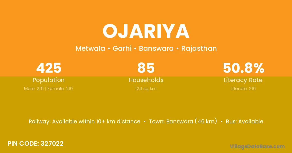 Banswara (46 km) is the nearest town to Ojariya village for major economic activities and is located approximately 46 km away.