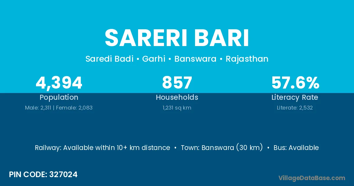 Banswara (30 km) is the nearest town to Sareri Bari village for major economic activities and is located approximately 30 km away.