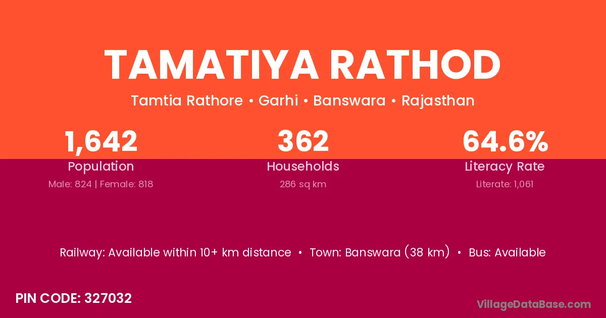 Banswara (38 km) is the nearest town to Tamatiya Rathod village for major economic activities and is located approximately 38 km away.