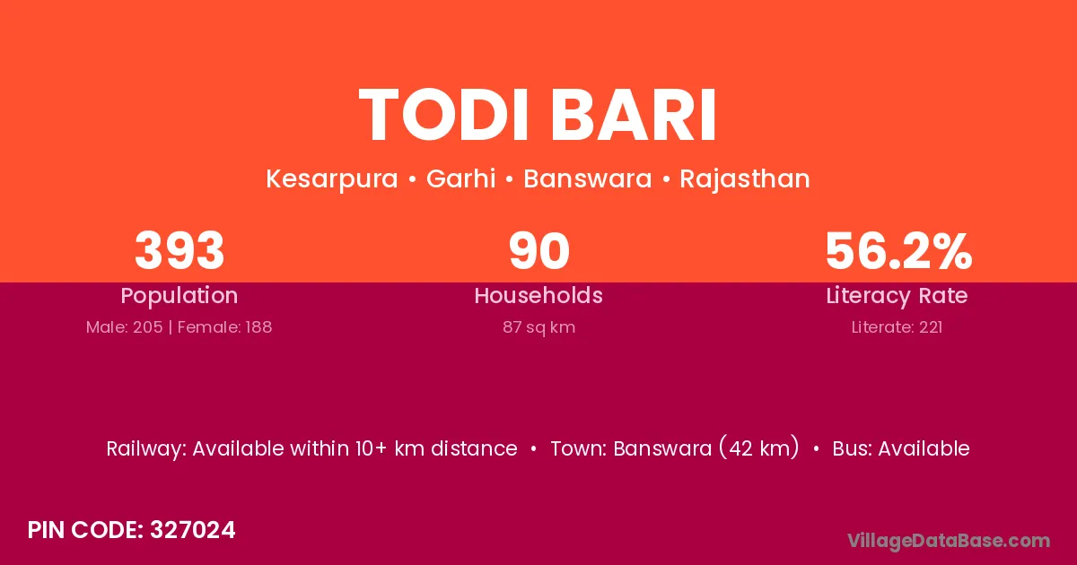 Banswara (42 km) is the nearest town to Todi Bari village for major economic activities and is located approximately 42 km away.