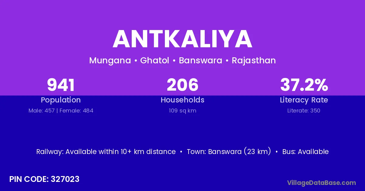 Banswara (23 km) is the nearest town to Antkaliya village for major economic activities and is located approximately 23 km away.